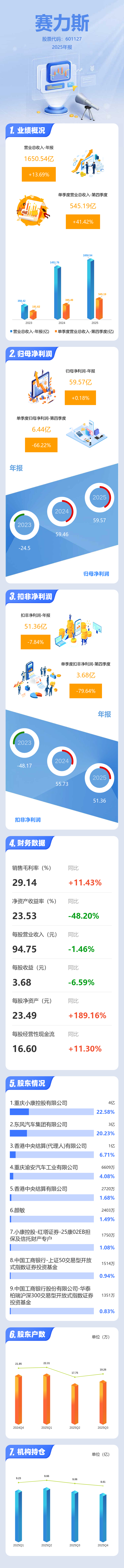 证券之星消息,赛力斯2025年年报显示,当年度公司主营收入1650.54亿元,同比上升13.69%;归母净利润59.57亿元,同比上升0.18%;扣非净利润51.36亿元,同比下降7.84%;其中2025年第四季度,公司单季度主营收入545.19亿元,同比上升41.43%;单季度归母净利润6.44亿元,同比下降66.23%;单季度扣非净利润3.68亿元,同比下降79.65%;负债率70.91%,投资收益2.94亿元,财务费用-4.2亿元,毛利率29.14%。